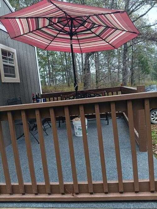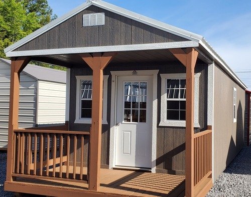 This cabin has a bedroom, a bathroom, & a living area. Also featuring a 6′ porch, and a 12×12′ back porch